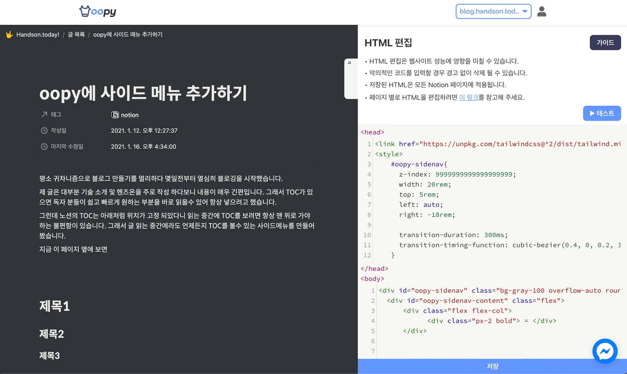 그런데 노션의 TOC는 위치가 고정 되있어서 읽는 중간에 TOC를 보려면 항상 맨 위로 가야 하는 불편함이 있습니다. 이를 해결하고자 글 읽는 중간에라도 언제든지 TOC를 볼수 있는 사이드 TOC 메뉴를 만들어 보았습니다.
