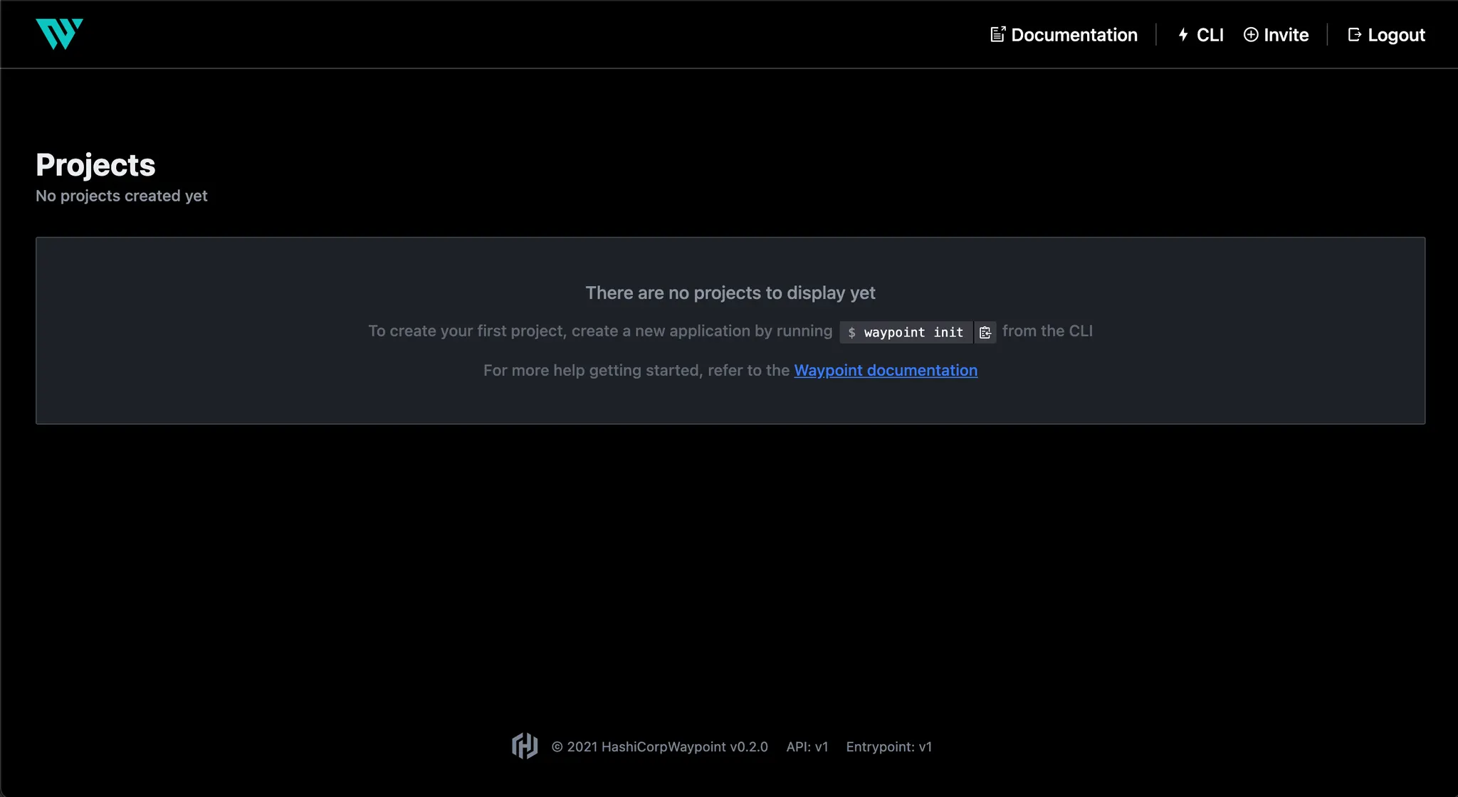 인증을 완료하면 프로젝트 페이지가 나오는데 아직 아무것도 만들지 않았기에 waypoint init  하라고 알려줍니다.