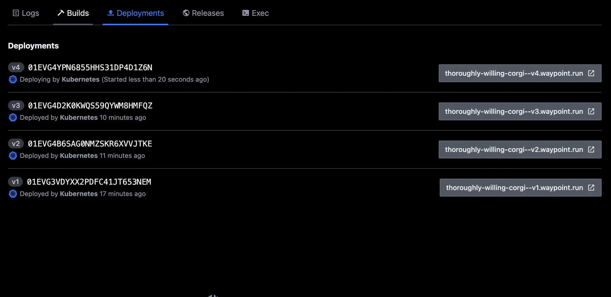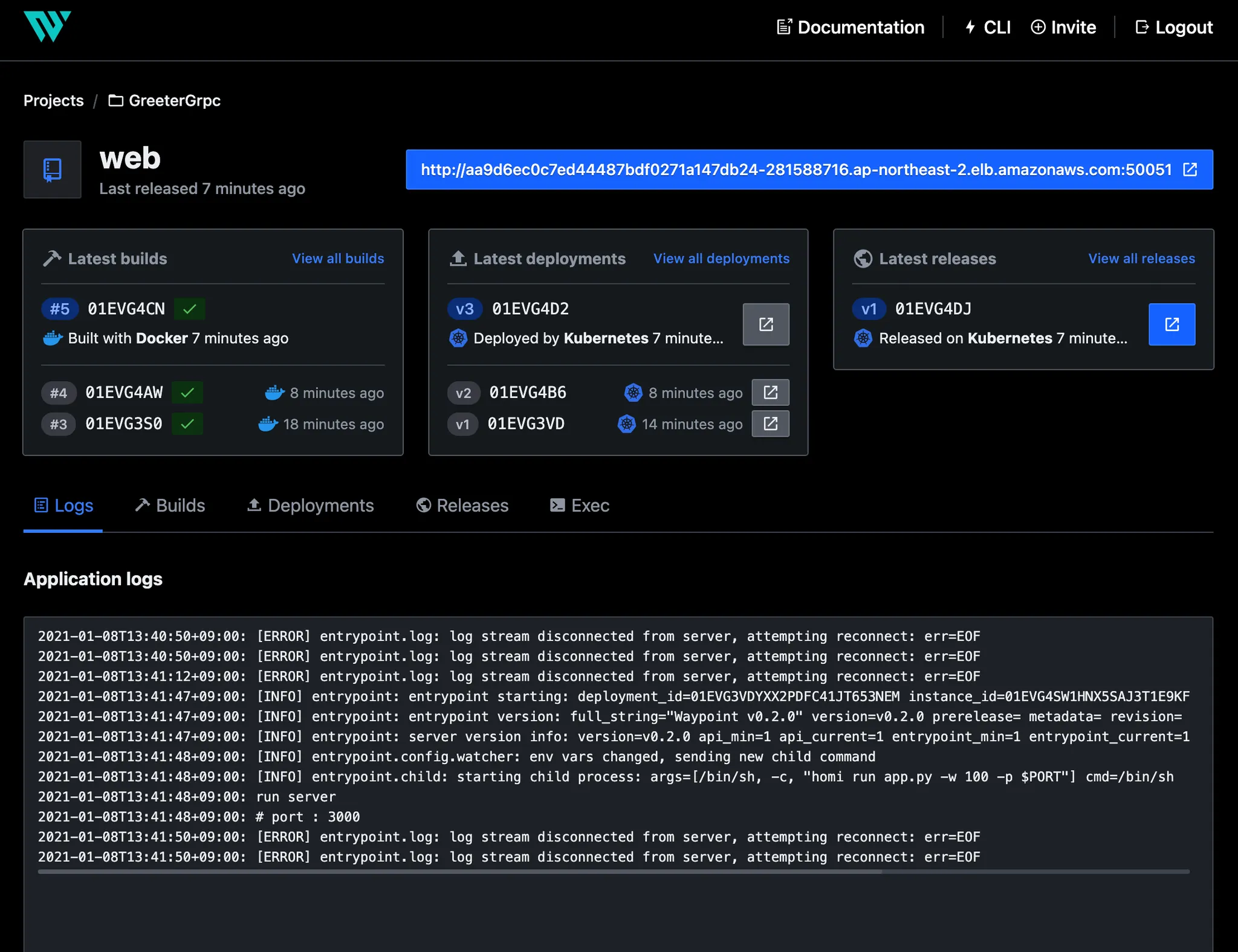 배포를 한뒤 waypoint ui로 접속 해보면 아래와 같이 배포 상태를 확인 할수 있습니다. 로그 역시 잘 뜨네요